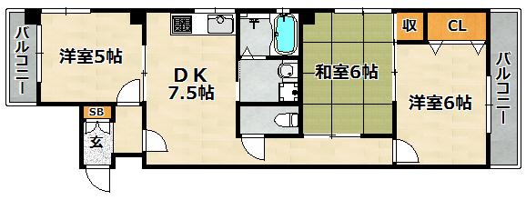 | 間取り詳細 | 和室 6畳 、 洋室 6畳 、 DK 7.5畳 、 洋室 5畳 |