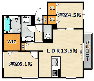 | 間取り詳細 | 洋室 4.5畳 、 洋室 6.1畳 、 LDK 13.5畳 |
