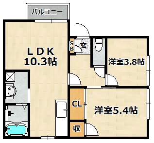 | 間取り詳細 | LDK 10.3畳 、 洋室 3.8畳 、 洋室 5.4畳 |