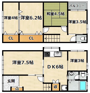 洋室 3.5畳 洋室 4畳 洋室 6.2畳 洋室 7.5畳 和室 4.5畳 DK 6畳 |