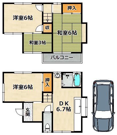 | 間取り詳細 | 和室 3畳 、 和室 6畳 、 洋室 6畳 、 洋室 6畳 、 DK 6.7畳 |