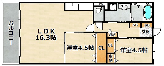 | 間取り詳細 | 洋室 4.5畳 、 洋室 4.5畳 、 LDK 16.3畳 |