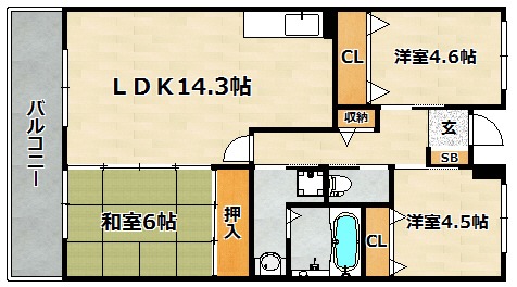 洋室 4.6畳 和室 6畳 LDK 14.3畳 |