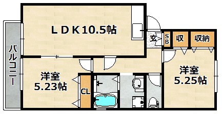 | 間取り詳細 | LDK 10.5畳 、 洋室 5.25畳 、 洋室 5.23畳 |