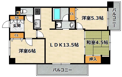 | 間取り詳細 | LDK 13.5畳 、 洋室 6畳 、 洋室 5.3畳 、 和室 4.5畳 |