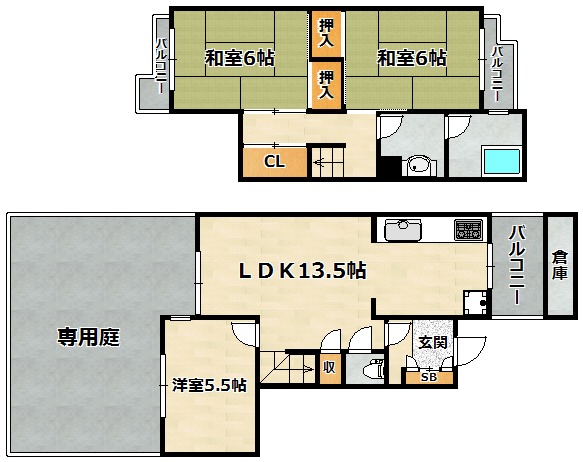 | 間取り詳細 | 和室 6畳 、 洋室 6畳 、 洋室 5.5畳 、 LDK 13.5畳 |