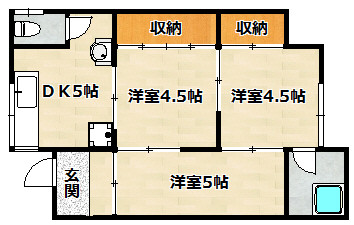 | 間取り詳細 | 洋室 4.5畳 、 洋室 4.5畳 、 洋室 5畳 、 DK 5畳 |