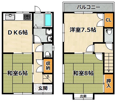 間取り詳細 | 和室 6畳 、 和室 8畳 、 洋室 7.5畳 、 DK 6畳 |