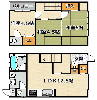 | 間取り詳細 | 和室 6畳 、 和室 4.5畳 、 洋室 4.5畳 、 LDK 12.5畳 |