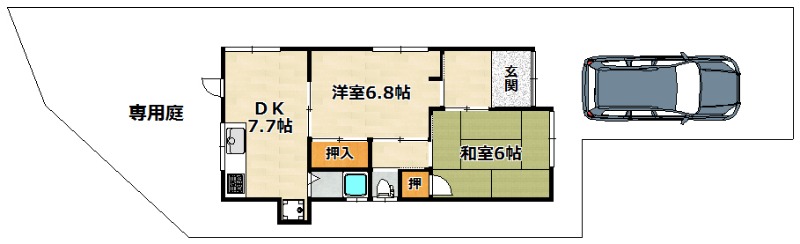 | 間取り詳細 | 洋室 6.8畳 、 和室 6畳 、 DK 7.7畳 |