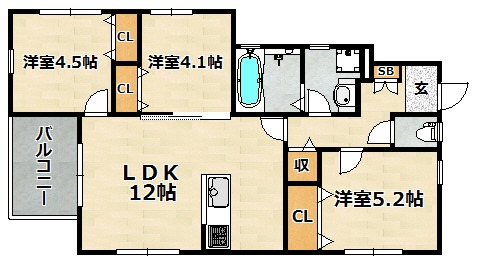 | 間取り詳細 | 洋室 4.1畳 、 洋室 4.5畳 、 和室 5.2畳 、 LDK 12畳 |
