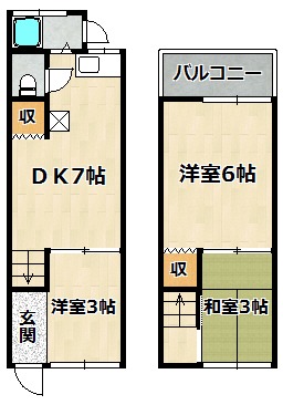 | 間取り詳細 | 洋室 3畳 、 和室 3畳 、 洋室 6畳 、 DK 7畳 |