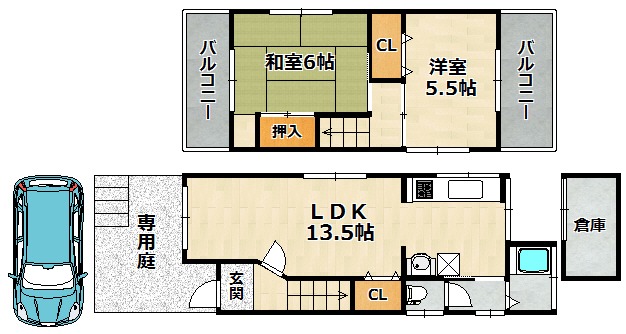 | 間取り詳細 | 洋室 5.5畳 、 和室 6畳 、 LDK 13.5畳 |