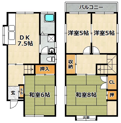 | 間取り詳細 | 和室 6畳 、 和室 8畳 、 洋室 5畳 、 洋室 5畳 、 DK 7.5畳 |